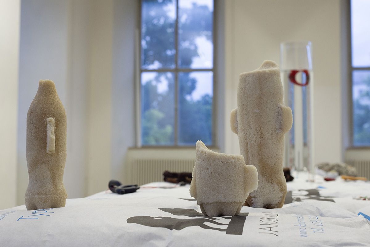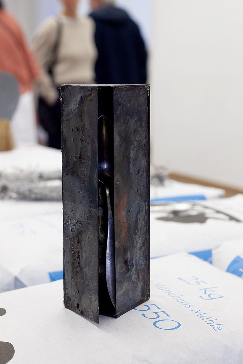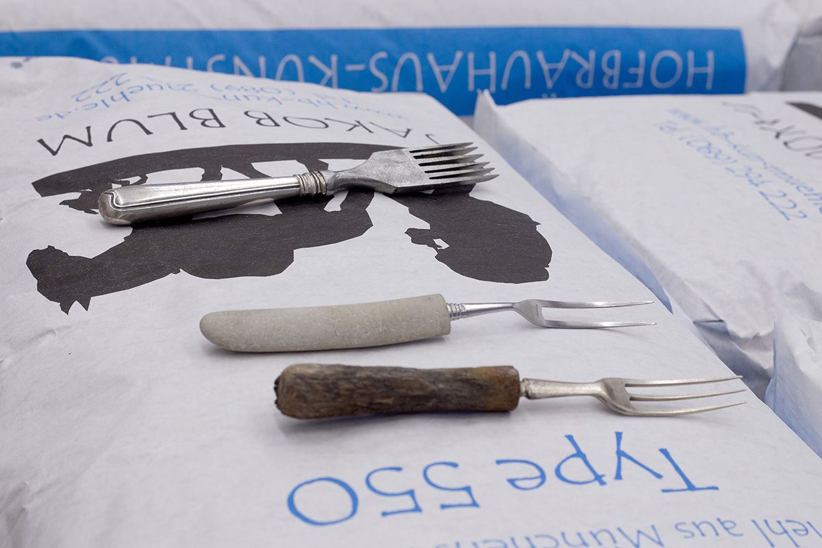 Die Ausstellung „Other Essentials“ greift diesen Gedanken auf, erweitert den Diskurs aber auch um Fragen des Wesens von Nothilfe. Die Installation präsentiert die Werke der Studierende auf Paletten von Mehl. Gemahlenes Getreide gilt als Grundnahrungsmittel in viele Kulturen. In einem Notzustand hat Nahrung zweifelsohne erste Priorität und trotzdem darf die immense Wichtigkeit, die kulturelle Objekte, Rituale und Traditionen für Menschen haben, nicht vernachlässigt werden. Die Frage wie vertriebene Kulturen ihre Identität wahren können oder ob die perfide Auslöschung von Kulturgut als Kriegsakt ausreichend strafverfolgt wird, bleibt vorerst ohne Antwort.
