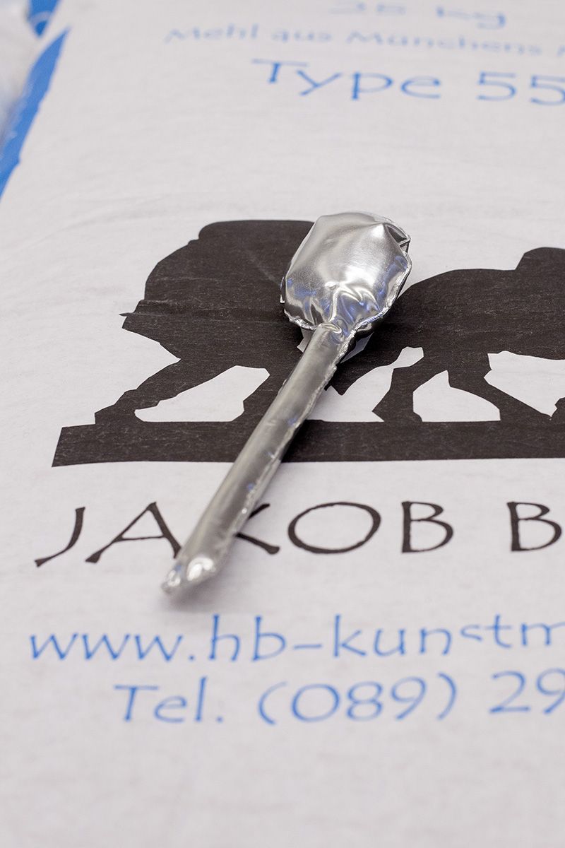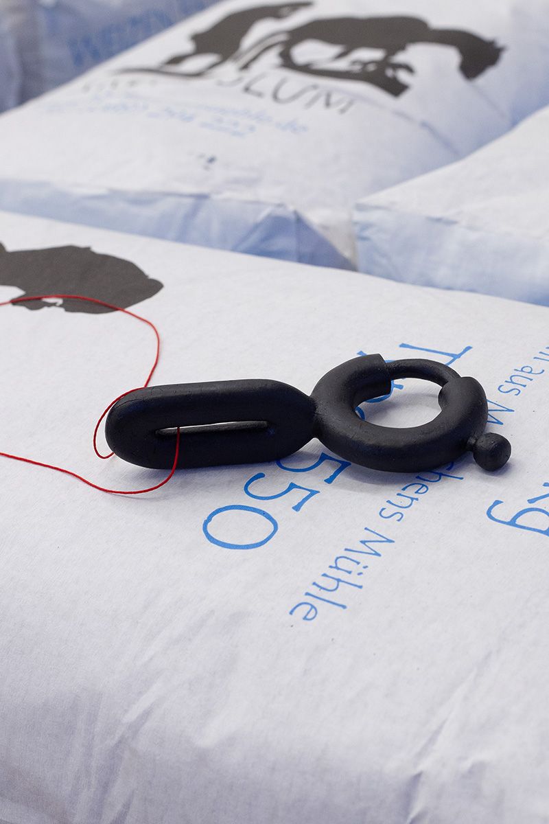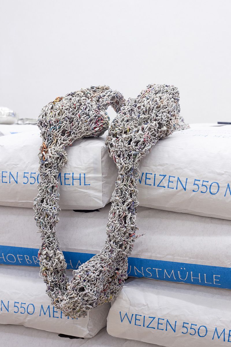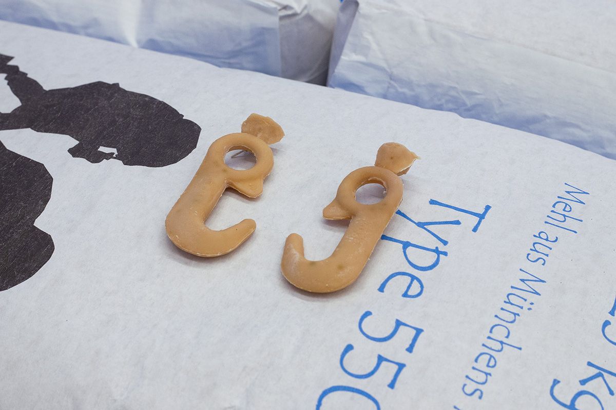 Die Ausstellung „Other Essentials“ greift diesen Gedanken auf, erweitert den Diskurs aber auch um Fragen des Wesens von Nothilfe. Die Installation präsentiert die Werke der Studierende auf Paletten von Mehl. Gemahlenes Getreide gilt als Grundnahrungsmittel in viele Kulturen. In einem Notzustand hat Nahrung zweifelsohne erste Priorität und trotzdem darf die immense Wichtigkeit, die kulturelle Objekte, Rituale und Traditionen für Menschen haben, nicht vernachlässigt werden. Die Frage wie vertriebene Kulturen ihre Identität wahren können oder ob die perfide Auslöschung von Kulturgut als Kriegsakt ausreichend strafverfolgt wird, bleibt vorerst ohne Antwort.