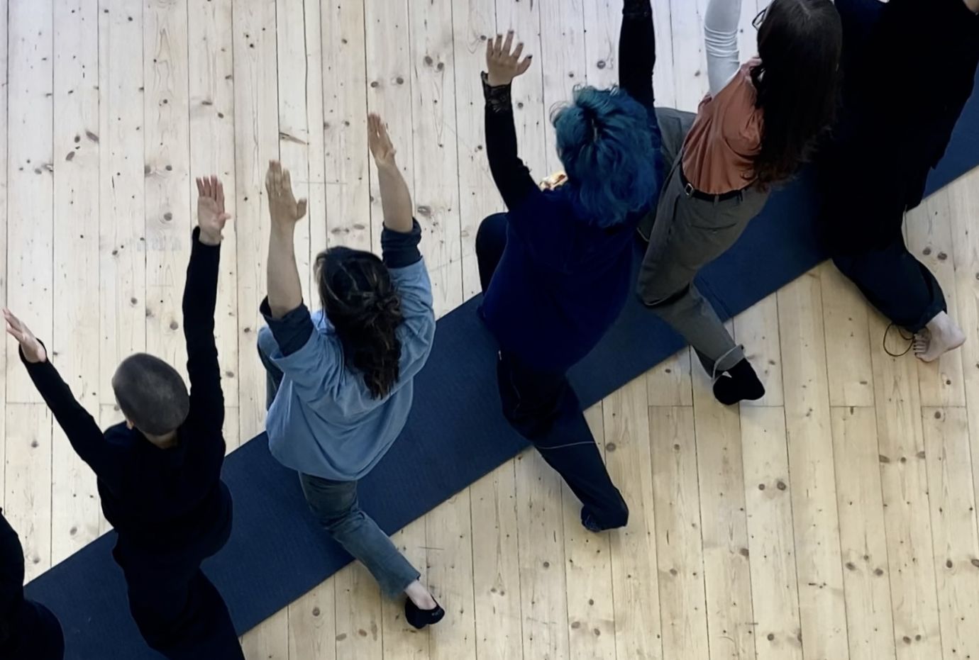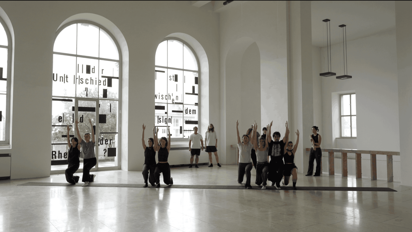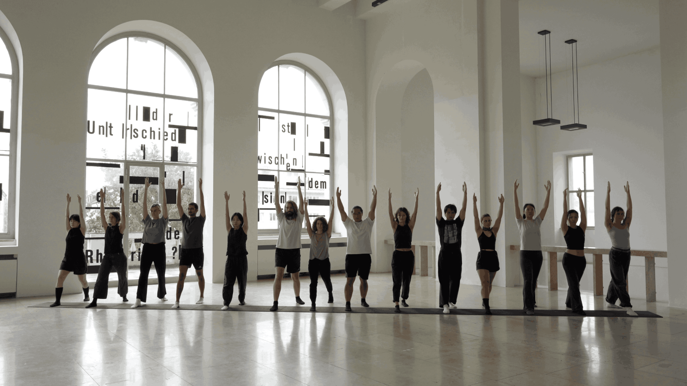 Auf einer schmalen Matte bewegen sich 14 Performer synchron. Wenn sie müde sind,