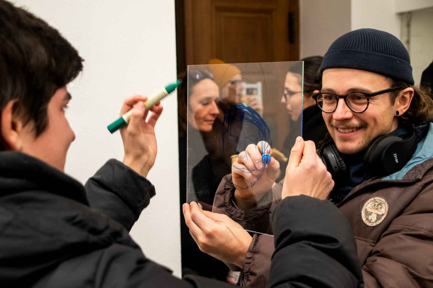 Dauer: ca. 60 Min | Mitmachaktion für Besucher*innenDie konzeptionelle Arbeit In Between Lines beginnt als partizipatorische Performance, die Identität als dynamischen Prozess erforscht. Zwei Teilnehmer*innen stehen sich gegenüber, lediglich getrennt durch eine transparente Glasscheibe, und zeichnen die Gesichter des jeweils anderen auf deren Oberfläche. Aufgrund ihrer Transparenz wird die Glasscheibe sowohl zur Barriere als auch zum Verbindungselement. Die Begegnung findet somit in einem Übergangsraum statt – einem „liminal space“, wie Victor Turner ihn beschrieb. Der Raum zwischen den Körpern wird zu einer Schwelle, an der sich Rollen verschieben und Identität fortwährend neu inszeniert wird. Die Grenzen zwischen dem Sehen und dem Gesehenwerden beginnen unwillkürlich zu verschwimmen.